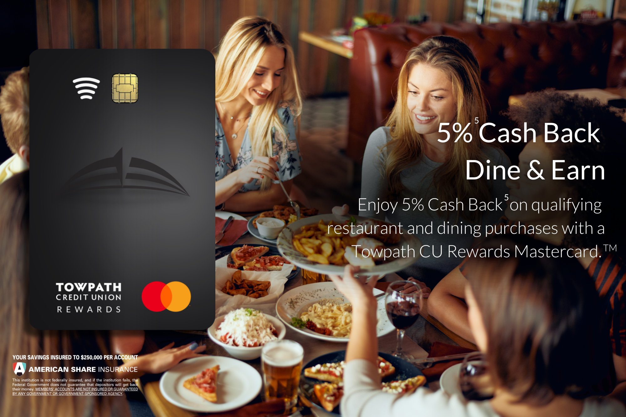 Spend simply and earn rewards with the TowpathCU Rewards MastercardTM! Earn rewards points or 1.5% cash back on all purchases.1